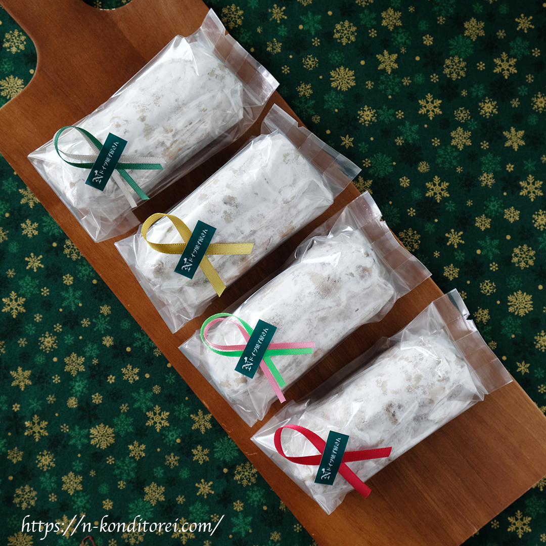 リボンで可愛くラッピングしたクリストシュトレン(小・4本セット)をお届けします。