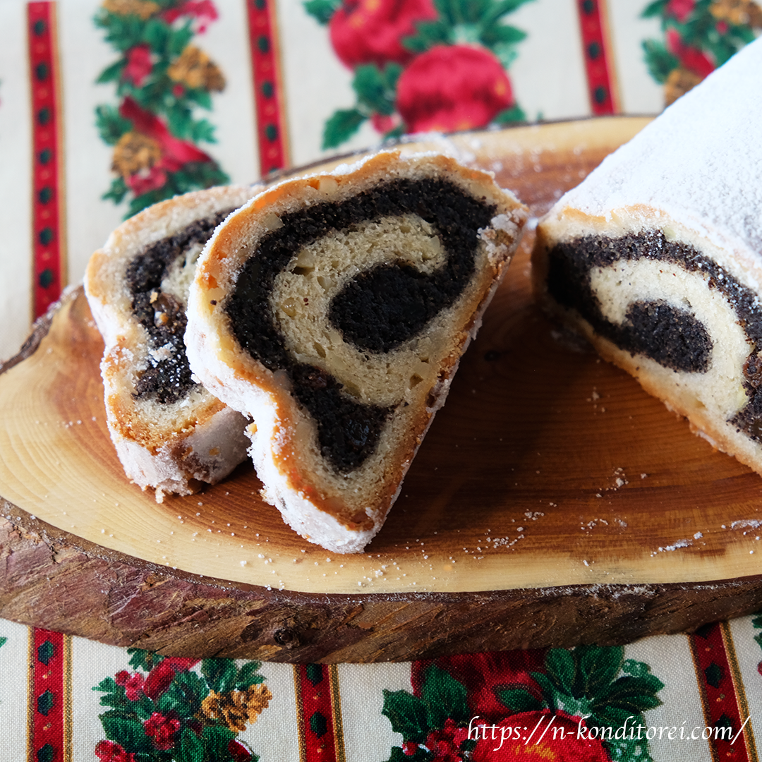 プチプチとした食感のモーンフィリングをアーモンドと柑橘ピール入りの生地で巻き込んだシュトレン